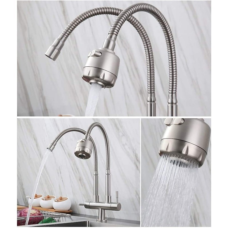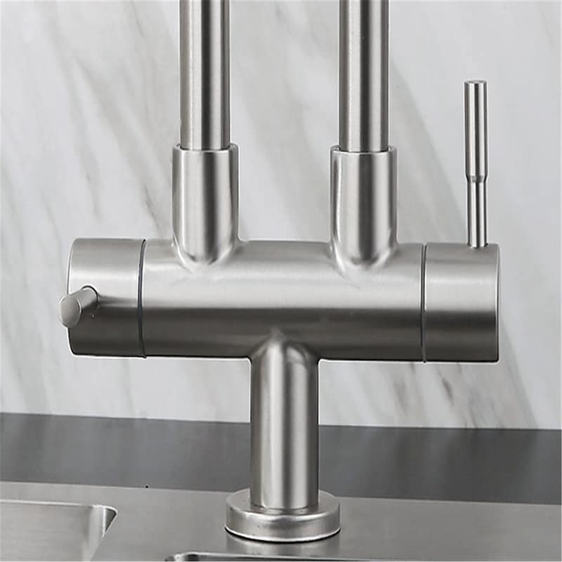 Tipo:Caño estándar,Estilo:Contemporáneo,Características:Giratorio,Tipo de grifo:Grifo de cocina,Tipo de instalación:Central,Caudal (L/min):0,2,Acabado:Acero inoxidable Acero,Orificios de instalación y manijas:Dos manijas, un orificio,Presión de agua (Mpa):0,02-0,7,